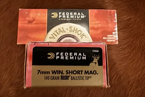 Federal Premium 7mm Win Short Magnum, 140 grain Nosler Ballistic tip (polymer tip), $ 65 per 20 r
