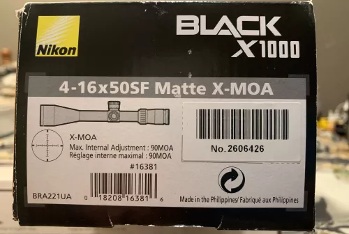 600.00 Nikon Black X1000 4-16X50SF X-MOA (This is a new never mounted scope) Sep 7, 2025 - 9:48 PM a-brace The Nikon Black X1000 4-16x50SF Matte X-MOA is a precision riflescope designed for serious shoote
