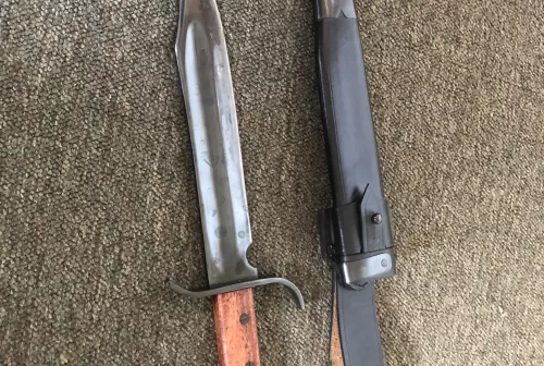 175.00 Cold Steel 1917 Frontier Bowie Sep 28, 2025 - 4:05 PM K____ Name: 1917 Frontier Bowie Blade Length: 12 1/4" Overall Length: 17 5/8"