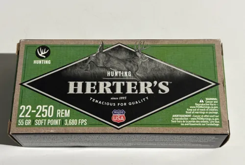 25.00 Herter’s 22-250 55gr SP 3680 FPS Feb 22, 2026 - 10:40 AM derp Doing some cleaning and found a box (20 rounds) of Herter’s 22-250 ammo.