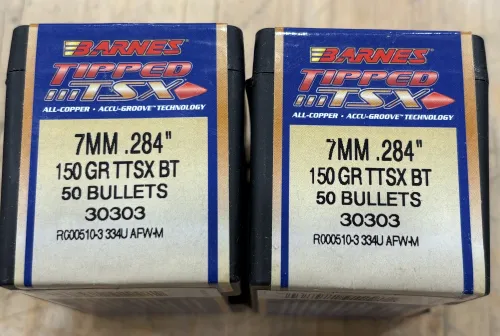 70.00 Barnes TTSX 150gn 7mm 0.284” Dec 8, 2025 - 7:41 PM jimm_54321 Brand: Barnes Type: Tipped Triple Shock Copper Bullets
