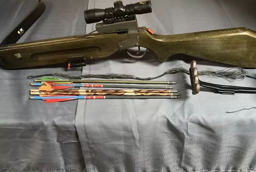 150.00 Astro Daco Hornet Sep 17, 2025 - 10:56 AM Hunterforever Vintage collectable Astro Daco Hornet 120lbs. Fitted with 4x30 NCstar scope.
