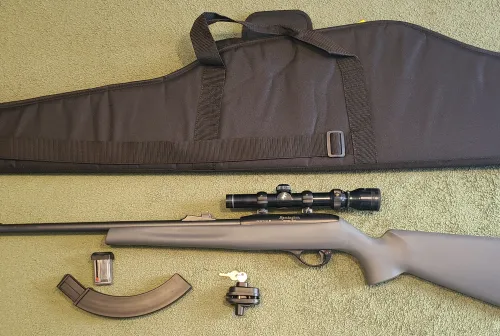 495.00 Remington 597 with scope and accessories Mar 15, 2026 - 9:08 AM RCEME411 Remington 597 22 LR semi auto with grey synthetic stock and open sights