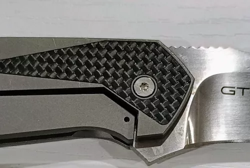 High carbon AUS 6m stainless steel partially serrated blade with grooved thumb stud and gimping.