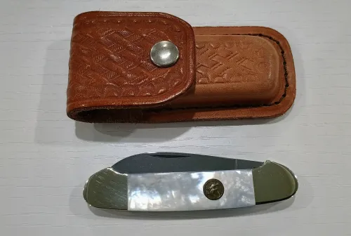 140.00 Bertram Hen and Rooster Pearl Canoe Folder Model 352-MOP Dec 29, 2025 - 12:21 PM JDknife Hen and Rooster Bertram Cutlery 2 blade mother of pearl handle canoe folding knife. Model no.