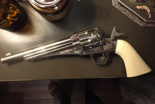 180.00 Remington .177 BB/pellet gun revolver Apr 20, 2026 - 3:47 PM colby lund Single action 6 shot metal .177 BB or .177 pellet gun Has custom fake bone grips.