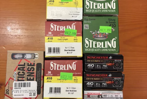 225.00 various .410 rounds, slugs and shot. Aug 27, 2025 - 11:57 AM enzosdad .410 slug and shot rounds about 300$ with taxes, yours for 225$