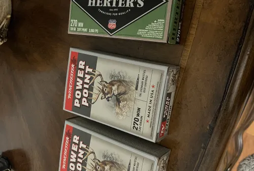125.00 BNIB 60 Round 270win Jan 7, 2026 - 6:42 PM Effiu Three boxes of 270 Win, two Winchester power point and one Herters.