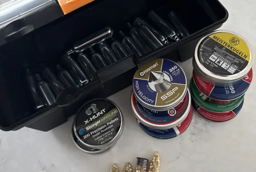 40.00 Pellets/ plombs Feb 25, 2026 - 1:18 PM ghis07 Environ 2200 pellets .177 et 400 en .22 et 16 bonbonnes de gaz , coffre inclus