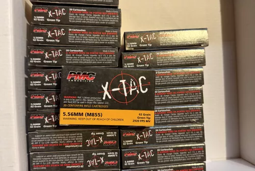 300.00 PMC X-TAC M855 5.56 NATO Green tip Oct 18, 2025 - 3:09 PM Jackman Selling 19 boxes (20 rounds each) of PMC X-TAC M855 — 5.56×45 NATO, 62 gr, green tip.