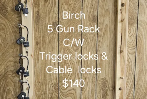 140.00 Birch 5 Gun C/W Triger & Cable Locks Feb 5, 2026 - 10:30 AM Clayton Cave Birch 5 Gun Rack C/W Triger & Cable Lock