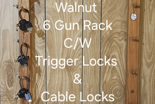 160.00 6 gun Rack C/W Triger & Cable Locks Feb 5, 2026 - 9:50 AM Clayton Cave Walnut Gun Rack C/W 6 Triger & Cable Locks