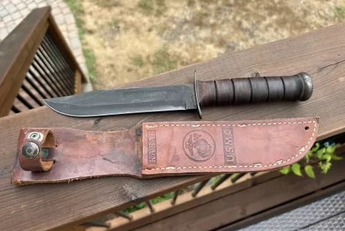 100.00 Vintage USMC KA-BAR Aug 26, 2025 - 11:41 AM deliverer Vintage USMC KA-BAR knife with leather handle and leather stamped sheath.