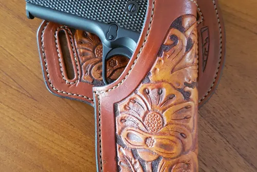 250.00 Custom made, hand carved Colt 1911 holster Feb 16, 2026 - 6:11 PM bushpilotmexico Made by a distinguished leather craftsman this holster fits a stock government model 1911 or clon