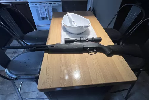 1150.00 Winchester deer gun Aug 16, 2025 - 2:00 PM John Easton Winchester super X pump 12 gauge deer gun with burrs shot gun scope 3x9x40 never used