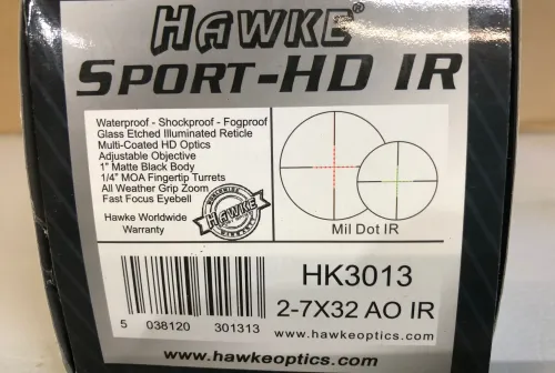 110.00 Hawke 2-7x32 AO IR Scope Feb 10, 2026 - 2:08 PM Norm Kelly Hawke 2-7x32 AO, IR HD scope, 1" tube. Very good condition.