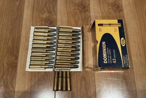 230.00 Canadian Dominion Manufactured 43 Mauser (11x60mm Mauser) Ammo & Brass Dec 21, 2025 - 1:44 PM purinn_kun There are 20 live rounds of factory load, and 4 once fired brass cases.