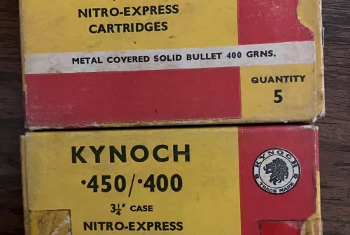 100.00 Kynoch 450/400 3 1/4" Nitro Express Oct 1, 2025 - 9:00 PM JurajSlivarich Kynoch 450/400 3 1/4" Nitro Express 1 box of 5 rounds of Solids