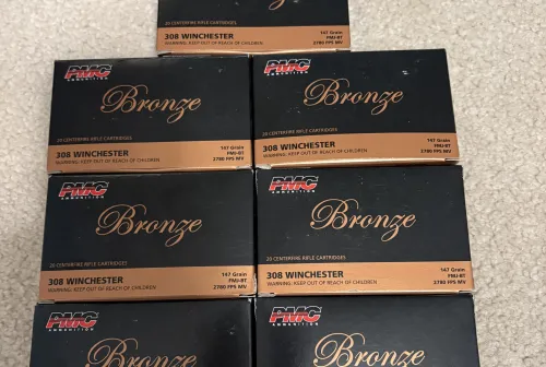 230.00 PMC Bronze 308 Win, 147gr FMJ, 8 boxes, 160 rnds Dec 12, 2025 - 5:50 PM Ngshoy I have 8 full boxes of PMC Bronze 308 totaling 160 rounds, all from the same lot