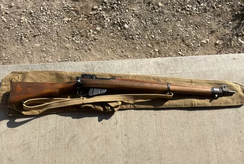 1250.00 Full wood No4 mk1 Sep 1, 2025 - 5:28 PM bcoutdoor No4 mk1 dated 1944, comes with canvas bag dated 1942 and pig sticker bayonet.