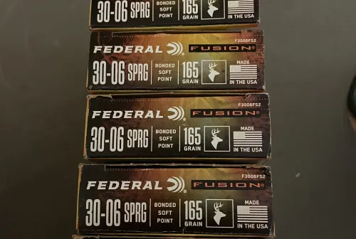 60.00 Federal Fusion 30-06 165gr Dec 10, 2025 - 6:22 PM _Trooper Six boxes of Fed. Fusion 165gr 30-06. $60ea or $300 for the lot.
