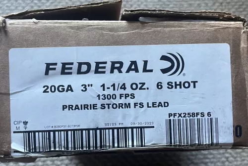 300.00 Federal Prairie Storm 20 gauge Sep 30, 2025 - 3:47 PM MAR-T 10 boxes, 1 case, 250 rounds of Federal Prairie Storm 20 gauge 3 inch 6 shot.