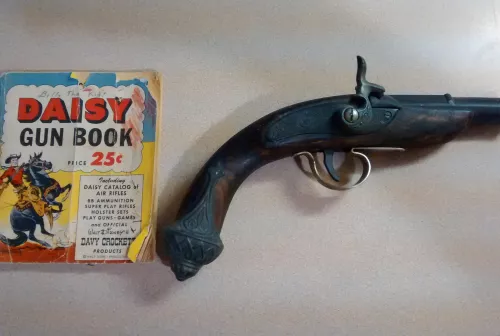 95.00 Antique Replica 18th century Pistol Single Shot and 1940's Daisy Gun Comic Book Oct 11, 2025 - 6:47 PM Snibor Replica pistol is from the 1940's as well as the comic book.
