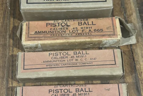 200.00 WWII .45 ACP M1911 Military Ammo Boxes – Frankford, Twin Cities & WCC (Lot) Jan 30, 2026 - 8:48 AM L.Mcknight Collector lot of original WW2 .45 ACP / M1911 military ammunition boxes.