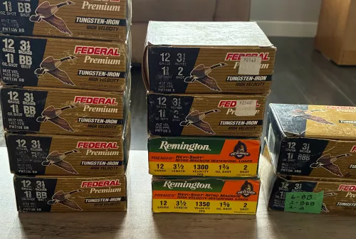 350.00 12 guage 3 1/2" Goose loads Oct 12, 2025 - 1:02 PM roosterblaster 11 Boxes with 10 shells 1 box with 6 shells $40 per box or $350 for the lot