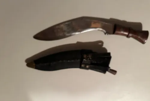 80.00 Kukri style knife with one small blade and sheath Dec 20, 2025 - 7:57 AM JimOttawa A little rust on the piece and one of the small blades is missing.