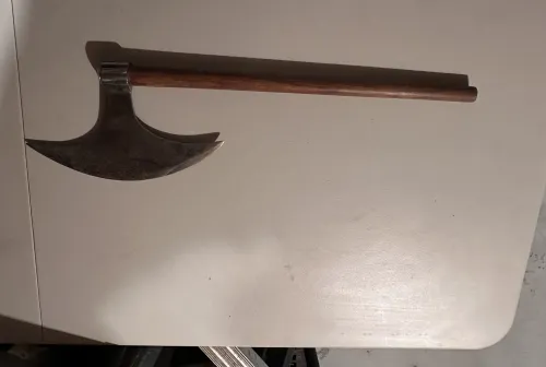 120.00 Double headed axe replica Dec 20, 2025 - 8:07 AM JimOttawa Slightly rusted handle is 24" a little movement in the handle Shipping extra