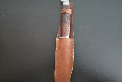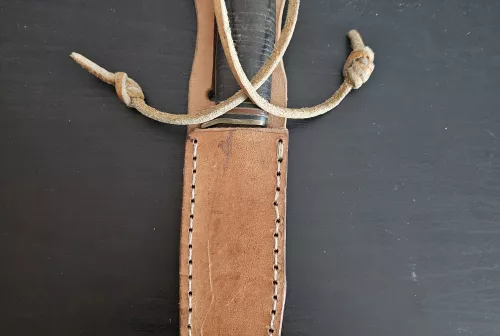50.00 Japanese Hunting Knife Aug 21, 2025 - 7:15 AM dmitrybo Vintage Japanese hunting knife with brown leather scabbard.