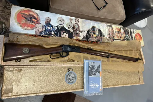 1350.00 Unfired Winchester NRA Centennial Musket30-30 Jan 16, 2026 - 8:35 AM Burl Winchester NRA Centennial Musket 30-30 unfired Lever Action 26” barrel. C/W box and paper work.