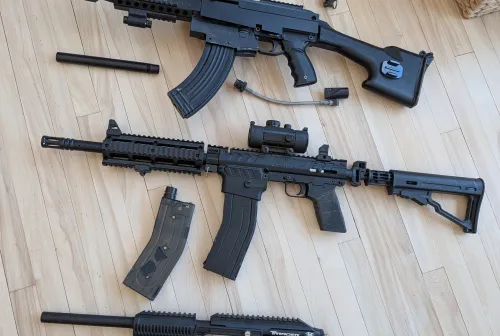 150.00 3 Modified Paintball Markers (A5, 98, and Empire Tracer) Price is for all 3 Apr 7, 2026 - 9:24 AM Vantage007 One Tippman A5 with M249 stock, metal tactical AK body shroud, aftermarket longer vented barrell,
