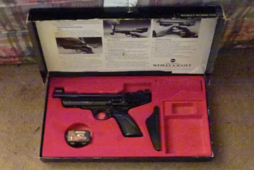 300.00 Webley Hurricane .177 with box very good comdition Aug 26, 2025 - 7:45 PM Waynesgpost Webley Hurricane .117 pellet gun in very good condition with box.