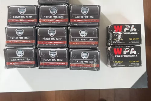 SOLD 180.00 13 boxes - 7.62x39 FMJ 123gr Non-Corrosive Aug 27, 2025 - 10:19 AM tjdennis1987 I have total of 13 boxes of 7.62x39mm, 123 gr, non-corrosive, steel case ammo for sale, 11