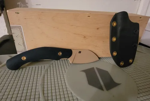 350.00 EJ Work Gleck Jan 9, 2026 - 11:40 AM vanislemoto EJ Work Gleck Tan Cerakote with Navy Micarta Handle and Kydex sheath. Brand new, unused