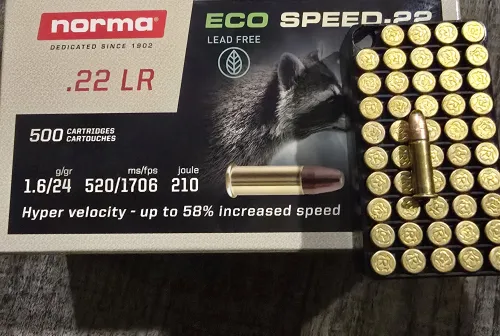 70.00 Norma 22lr eco speed Mar 5, 2026 - 7:22 PM chase95 Norma 22lr eco speed. Lead free 24 grain copper rounds. 1700fps. Boxes of 500.