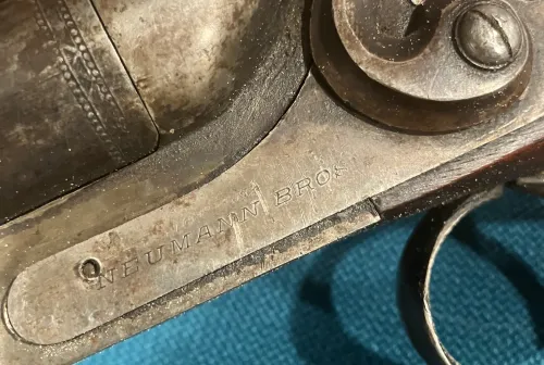 SOLD 375.00 Nuemann Bros Antique Shotgun Dec 13, 2025 - 6:47 AM steve enfield No Pal required! Nuemann Bros antique black powder side-by-side percussion shotgun.