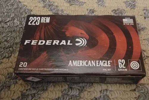 250.00 .223 Rem. American Eagle 62 Grain - 19 boxes Jan 11, 2026 - 8:14 PM wik.haider 19 BNIB boxes x 20 rounds = 380 rounds. American Eagle 62 grain ammo.