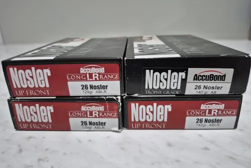 Swap / Trade 26 NOSLER LR Trophy & Long Range Grade 129 grn to 142 grn. Apr 24, 2026 - 12:14 PM Brutemax 4 Sealed NOSLER 26 LR Caliber in 129 grn, 140 grn & 142 grn factory packaged.