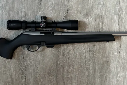 700.00 Remington 597, Vortex diamondback Mar 14, 2026 - 11:24 AM Glasgow S Stainless 597, has volquartsen hammer and a vortex diamondback tactical 3-9 in warne aluminum rin