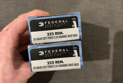65.00 Federal .222 ammo 50 gr. Dec 26, 2025 - 4:15 PM timhark Two brand new, full boxes of .222 REM. 50 grain soft point ammo. $65 for both boxes.