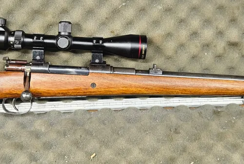 SOLD 475.00 30-06 Swedish Commercial Mauser Feb 10, 2026 - 6:14 PM Vodamin Konahrik *-$75 if you don't want the scope and rings. Commercial emblem is under scope base.