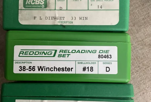 150.00 As new 38-56.. 40-65,,, 33 Win dies Price is for each set Mar 3, 2026 - 6:43 PM Muddy Three sets of reloading dies, bought from Prophet River last year, these were used to neck down 4