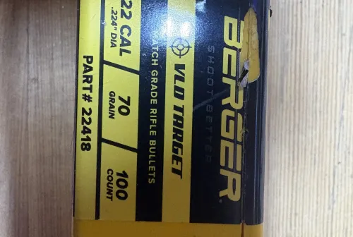 50.00 70 gr Berger vld 22 cal Mar 19, 2026 - 9:50 AM Hossman 96 bullets 70 gr 22 cal 50 plus shipping
