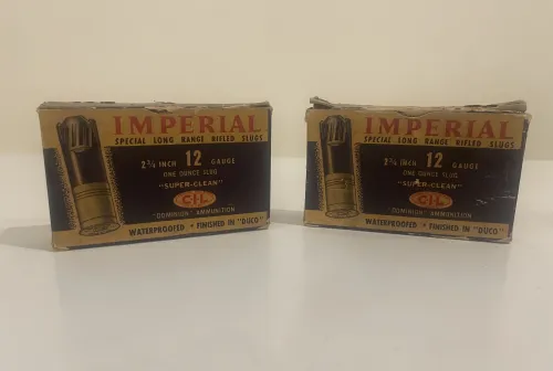 20.00 Vintage Imperial Slugs Feb 20, 2026 - 5:24 PM Shaneadams Selling 2 box’s of 1950’s or early 1960’s production Imperial 12 gauge 2 3/4” 1 OZ slugs.