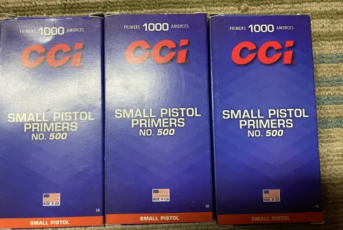 100.00 3000 CCI SMALL PISTOL PRIMERS Jan 26, 2026 - 5:57 PM bowtie 3000 CCI SMALL PISTOL PRIMERS for sale. Three bricks. $100 each or $250 for all three.