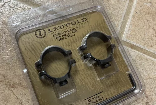 65.00 Leupold dual dovetail low scope rings Dec 29, 2025 - 1:42 AM GregMr Set of Leupold dual dovetail, 1” low, matte, steel scope rings. New in package.