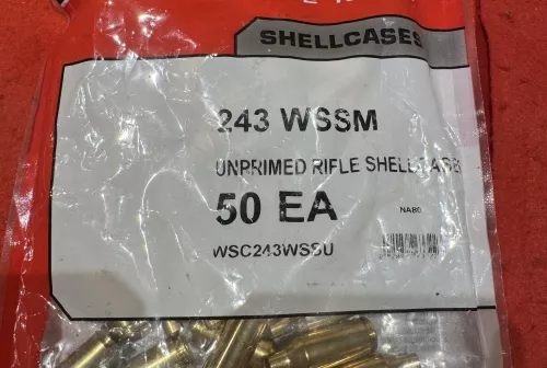 75.00 Winchester 243 WSSM brass Nov 15, 2025 - 11:09 AM DSlaght Winchester 243 Wssm brass unopened, count 50 , $75
